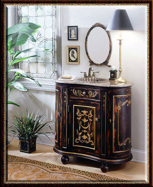 This Designer Antique Finish Sink Cabinet has a luxurious curved brown marble counter top with an antique brass finished faucet and a pumpkin style sink. A regal hand painted gold design motif is carefully detailed within the gold trimmed frame panel on the front cabinet door.