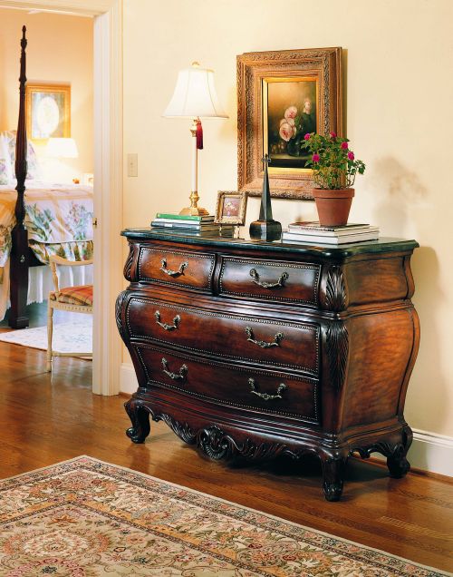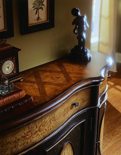 serpentine-shaped chest with floral hand-painting, a hand-painted black