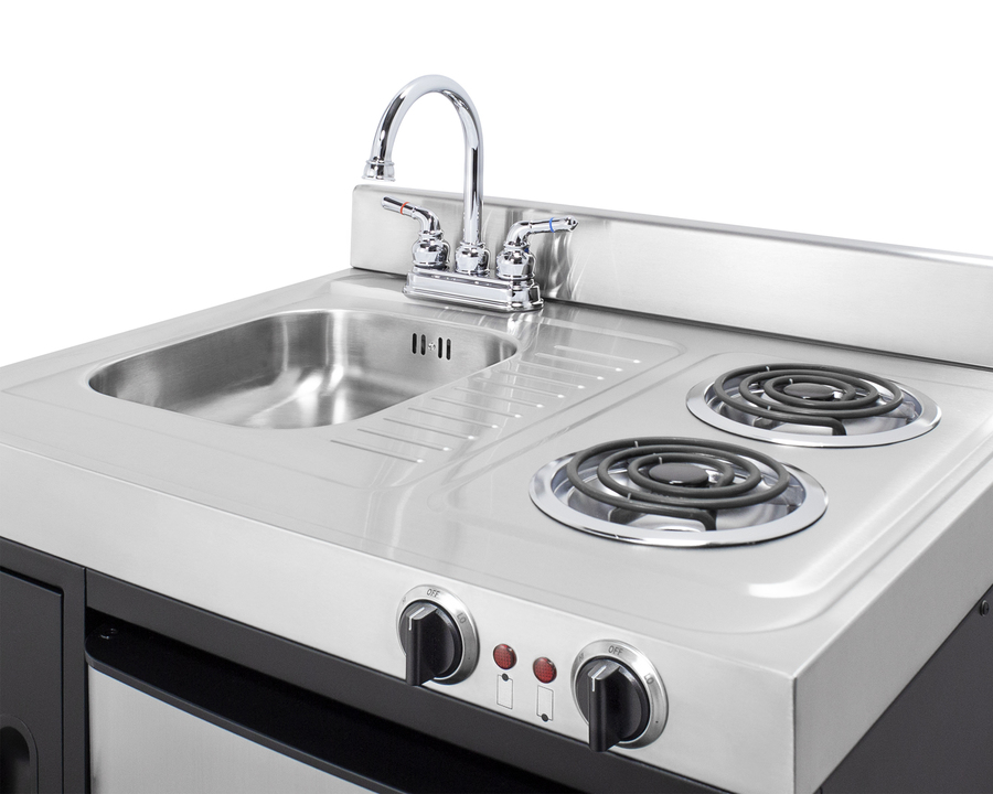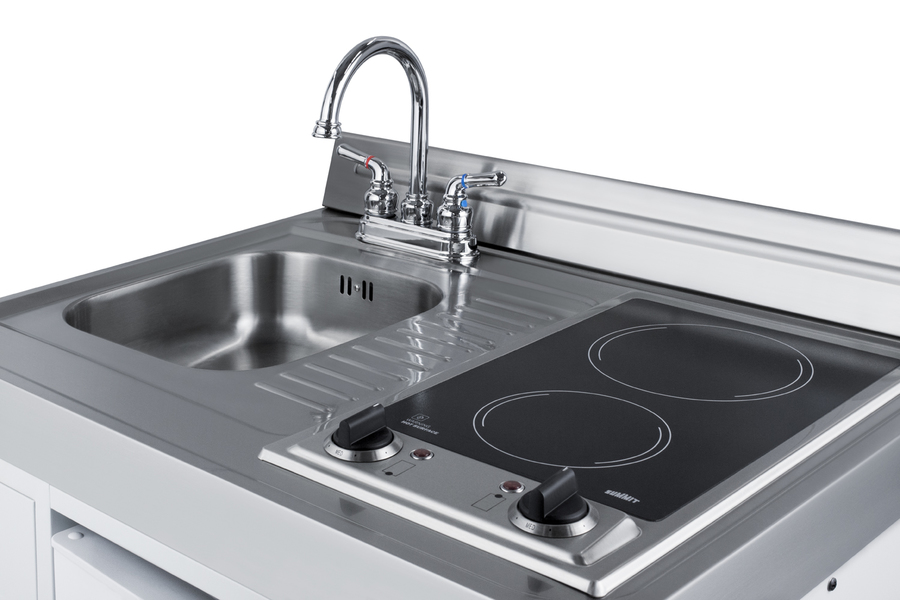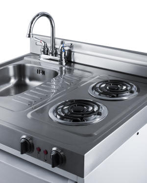 unit, 3-in-1 kitchen, sink with 2-burners, efficiency compact kitchen,